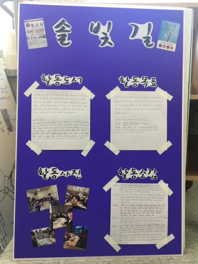 - 바이오환경공학과 재학생들로 구성된 솔빛길은 '언제 어디서나 제약없이 책일자'를 목표로 꾸준한 독서와 토론활동을 통해 비판적 시각과 커뮤니케이션 능력 함양을 위해 노력하고 있습니다.