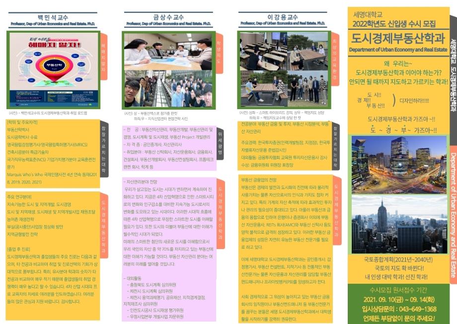 본문 시작 홈으로 학과 소식 학과소개 취업 및 진로 언론 및 보도 학과 소식 대학원 홈페이지가이드 행사사진게시판 행사사진게시판 공지사항 일반자료실 강의자료실 부동산학보 동아리 행사사진게시판 페이스북 트위터 프린트 학과명칭 변경 도시경제부동산학과 홍보리플렛 부동산학과 3600 2021-06-16 세명대학교 부동산학과가 2022학년도 '도시경제부동산학과'로 새롭게 탄생합니다. 세명대학교 부동산학과가 2022년 '도시경제부동산학과'로 새롭게 탄생합니다. 격변하는시대에 맞춰 전문적이고 수준높은 교육을 위하여 도시경제부동산학과가 여러분들과 함께 할 것입니다. 작성자 : 부동산학과 조교 목록 이전학과장님과 다빈학생회! 다음 한국법이론실무학회활동하는 도경제부동산학과 김상진교수 담당부서 : 부동산지적학과 담당자 : - 연락처 : 043-649-1784 최종수정일 : 2024-10-26 만족도조사 만족도 조사 이 페이지에서 제공하는 정보에 대하여 만족하시나요? 매우만족 만족 보통 불만족 매우불만족
