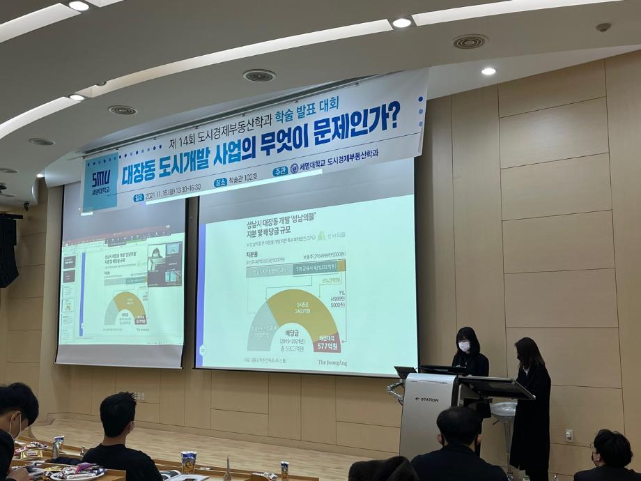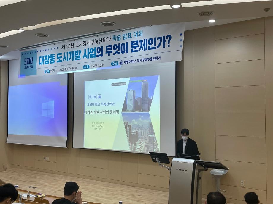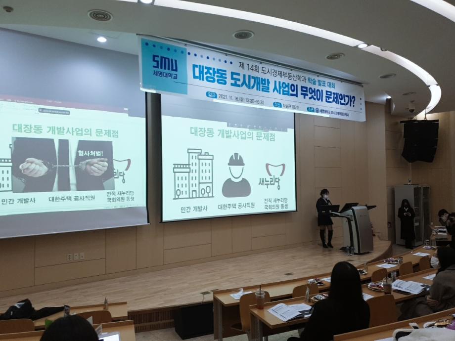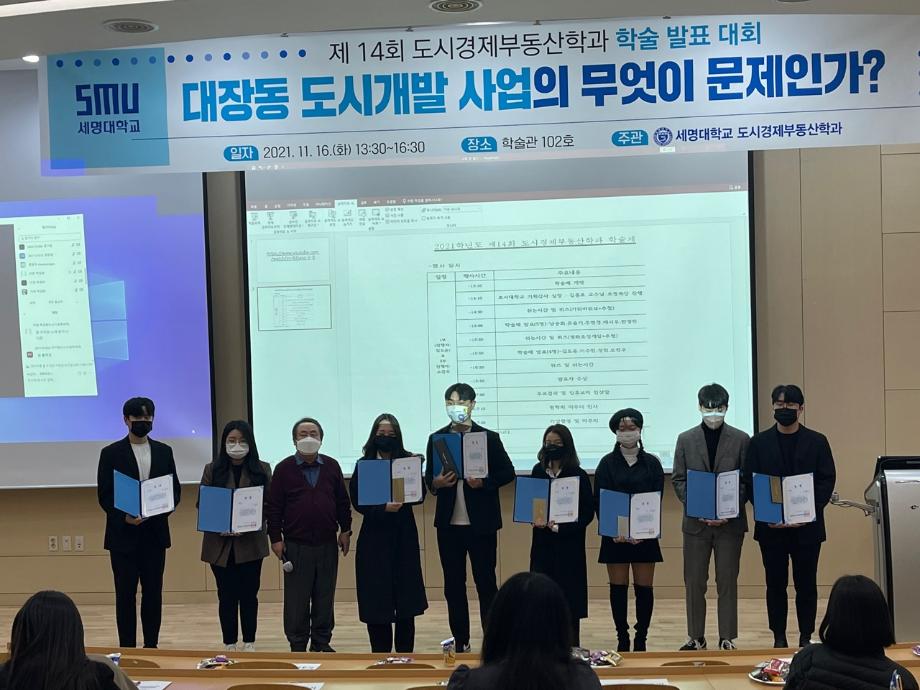2021학년도 제 14회 도시경제부동산학과 학술제를 진행했습니다. “대장동 도시개발사업의 무엇이 문제인가?” 주제로 도시경제부동산학과 전공자로서 도시개발사업의 내용과 절차 사례를 바탕으로 이슈화되고 있는 대장동 도시개발사업의 문제가 무엇인지 분석하고 결론을 발표하였습니다. 큰 이슈로 국민 모두의 관심이 쏠려있는 트렌디한 학술제 주제로 도시경제부동산학과 학생회에서 주최하는 행사로서 학생들은 항상 최신의 부동산정보와 진의에 대하여 탐구하는 자세로 행사에 임했습니다. 예심을 통과한 9명의 발표자는 최종심사로 8명의 수상자가 결정되었습니다. 모두들 축하합니다.