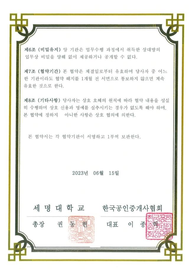 세명대학교(총장 권동현)와 한국공인중개사협회(협회장 이종혁)는 세명대학교 부동산지적학과의 발전을 위하여 상호 협약을 체결하고 다음과 같이 협약하였다.
