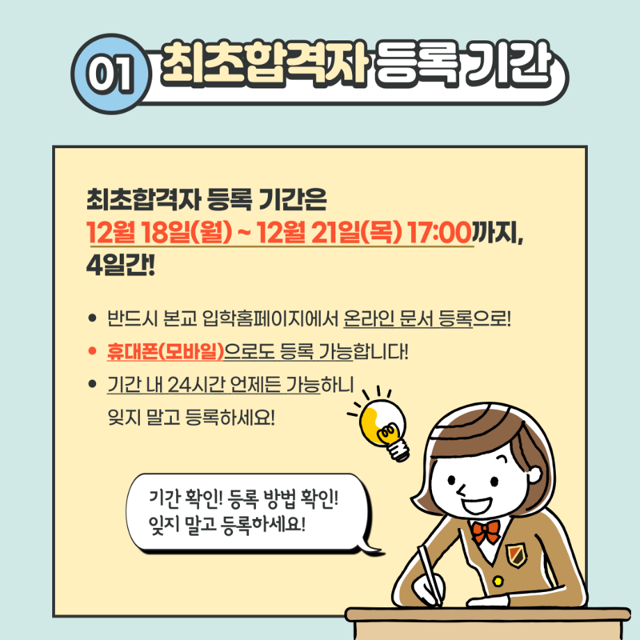최초합격자 등록기간은 12.18. ~ 12.21. 17:00까지 4일간 진행되며 본교 입학 홈페이지에서 온라인 문서 등록, 휴대폰(모바일)로 등록 가능합니다.