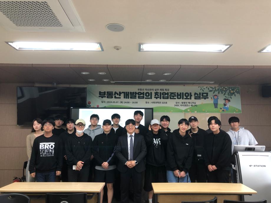 내용 : HDC 아이콘앤스 황종인 강사님은 부동산자산관리실무체험 에 특강을 해주셨습니다. 학교에서 배우기 어려운 부동산개발과 취업준비특강을 구체적으로 설명을 해주셨습니다. 학생들은 부동산분야의 진로에 깊이 고민하고 답을 얻는 시간이였다고 생각합니다.