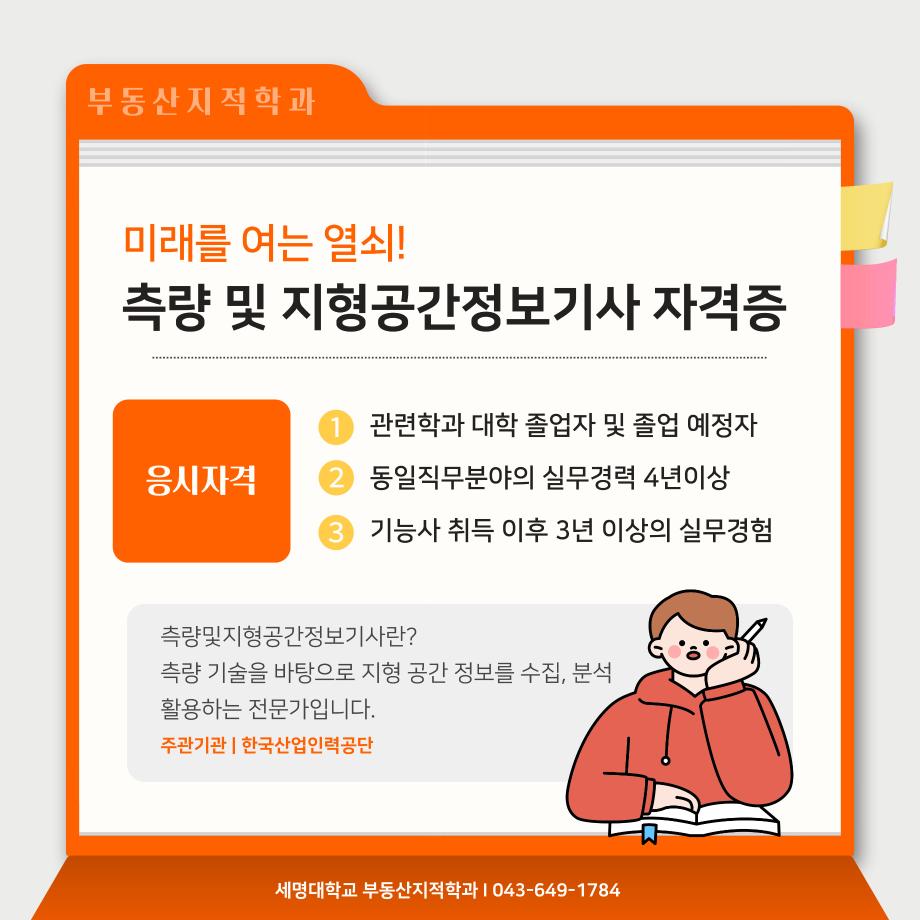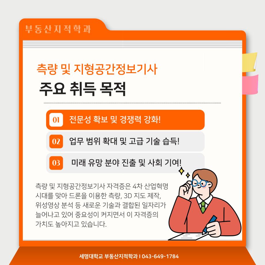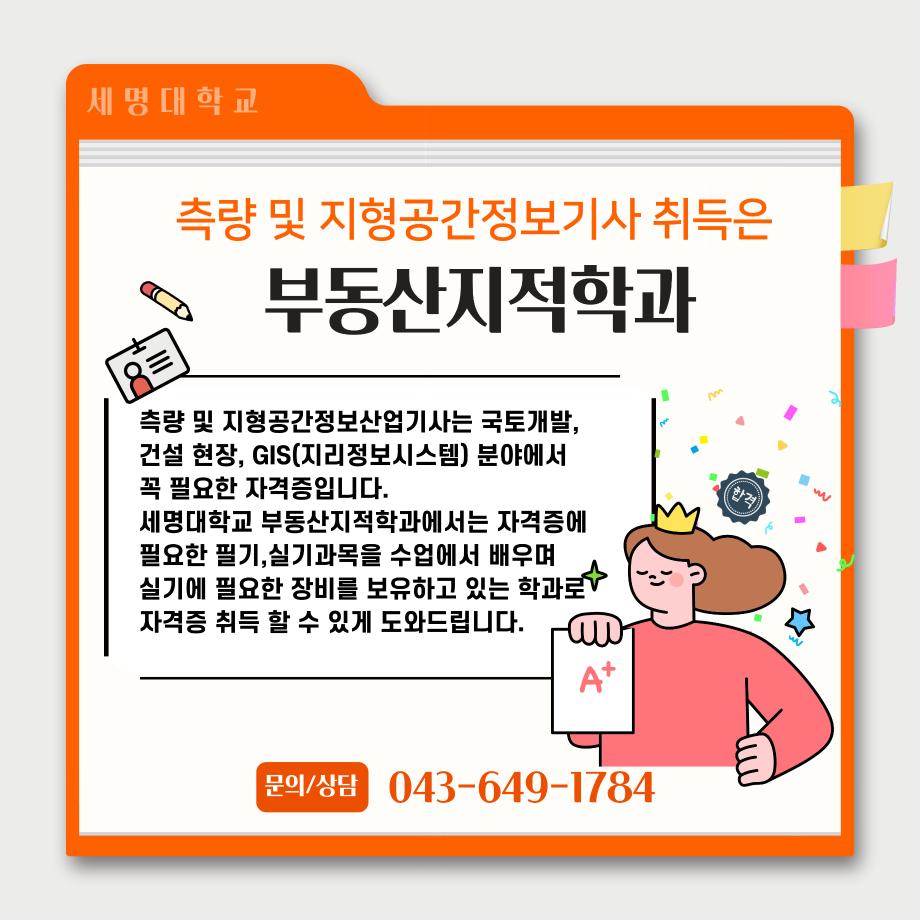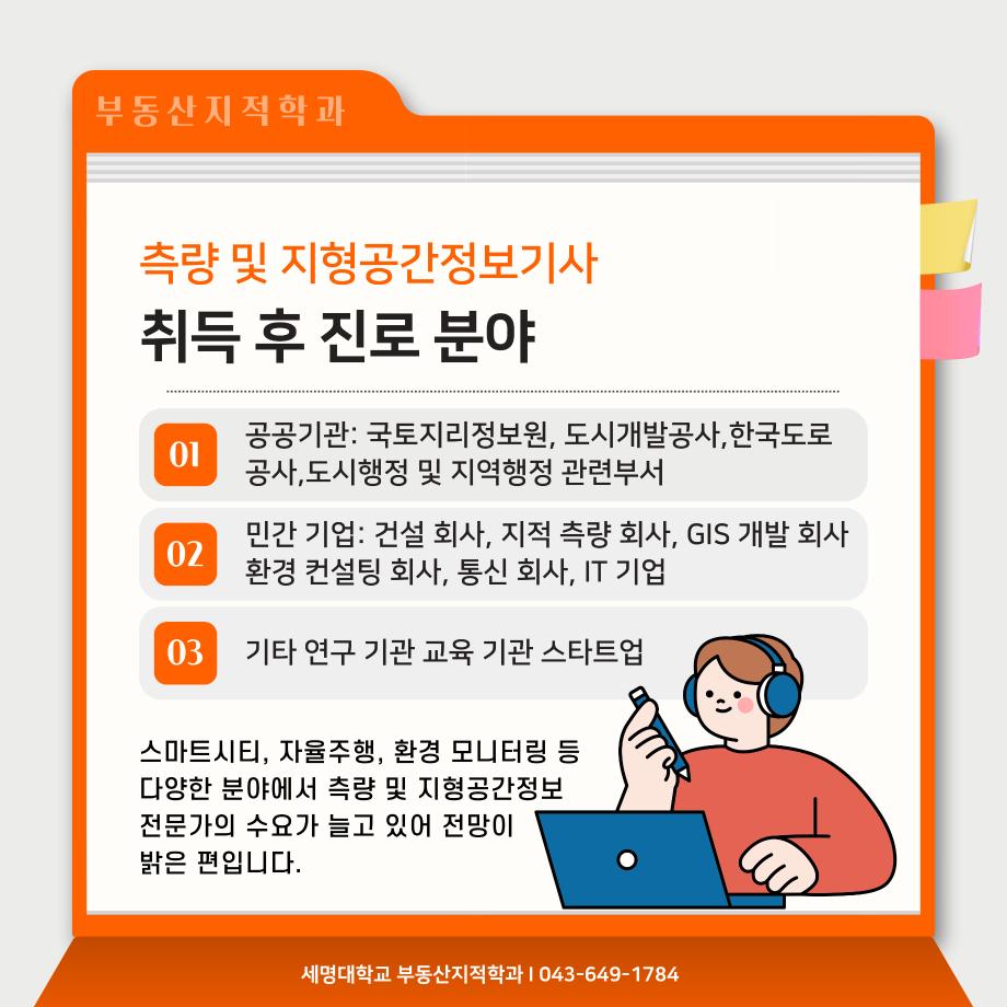 본문 시작 홈으로 학과 소식 학과소개 취업 및 진로 언론 및 보도 학과 소식 대학원 홈페이지가이드 행사사진게시판 행사사진게시판 공지사항 일반자료실 강의자료실 부동산학보 동아리 행사사진게시판 페이스북 트위터 프린트 측량 및 지형공간정보기사 소개카트 부동산지적학과 2493 2024-12-09 측량 및 지형공간정보기사 소개입니다. 측량 및 지형공간정보기사에 관심있는 학생들은 참고하여 주세요. 목록 이전자산관리사 소개 카드입니다. 다음 (주)올포랜드와 1억5천 상당 소프트웨어 현물기부 협약체결 담당부서 : 부동산지적학과 담당자 : - 연락처 : 043-649-1784 최종수정일 : 2024-10-26 만족도조사 만족도 조사 이 페이지에서 제공하는 정보에 대하여 만족하시나요? 매우만족 만족 보통 불만족 매우불만족