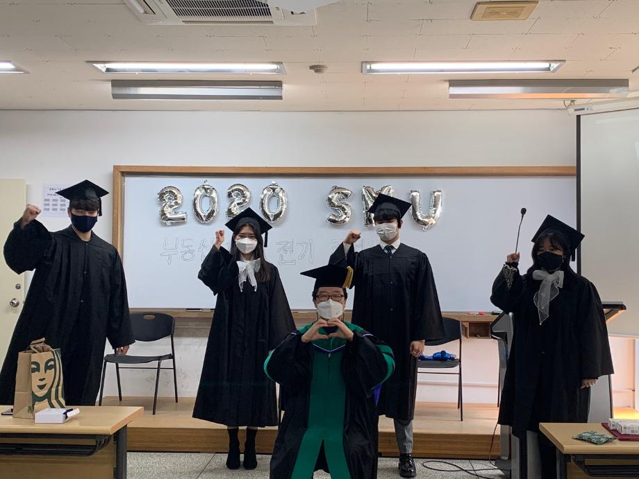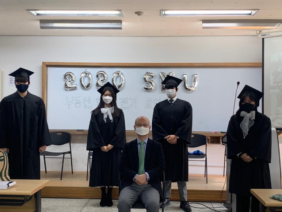 부동산학과에서 2020학년도 전기 졸업식을 ZOOM을 활용한 실시간 비대면으로 진행 하였습니다. 외부 표창 수상자 4인은 대면으로 졸업식에 참여 하였습니다. 코로나로 인하여 졸업식이 전면 취소되고 있는 상황입니다. 졸업생들의 아쉬움이 크다고 생각되어 비대면 졸업식을 실시 하게 되었습니다. 학생들의 졸업을 진심으로 축하합니다.