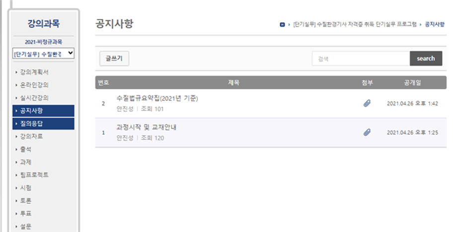 이를 위해 현장 실무 전문가를 초빙하고 수질환경기사 자격증 취득에 목적을 두며 특강을 진행하였습니다.