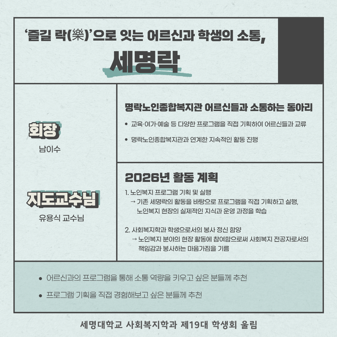 명락노인종합복지관 어르신들과 함께 즐거운 소통과 나눔을 실천하는 사회복지학과 봉사 동아리입니다.
