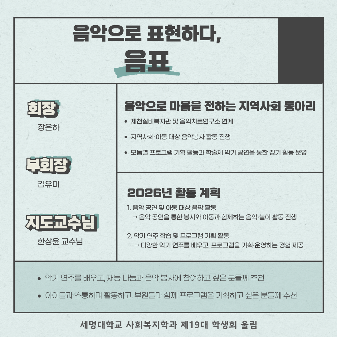 음표는 ‘음악으로 표현하다’라는 의미를 가진 동아리로, 다양한 악기와 목소리를 통해 지역사회에 음악 재능봉사를 실천하고 있습니다.
